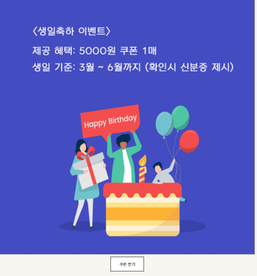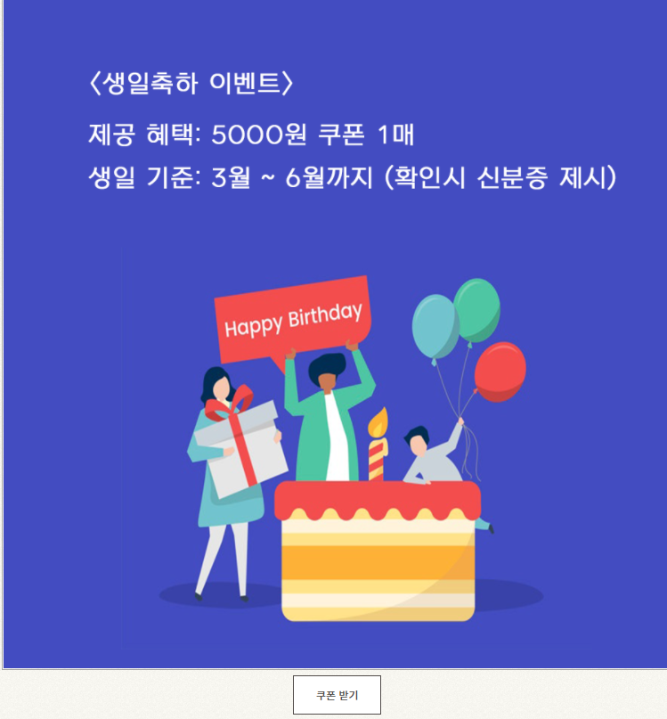 생일축하 이벤트 쿠폰은 생일 기준이 3월~ 6월사이인 고객에게만 쿠폰을 줍니다.