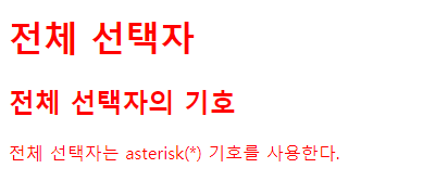 주로 모든 하위 요소에 한꺼번에 스타일을 적용할 때 사용하고 전체 선택자는 asterisk(*) 기호를 사용합니다.