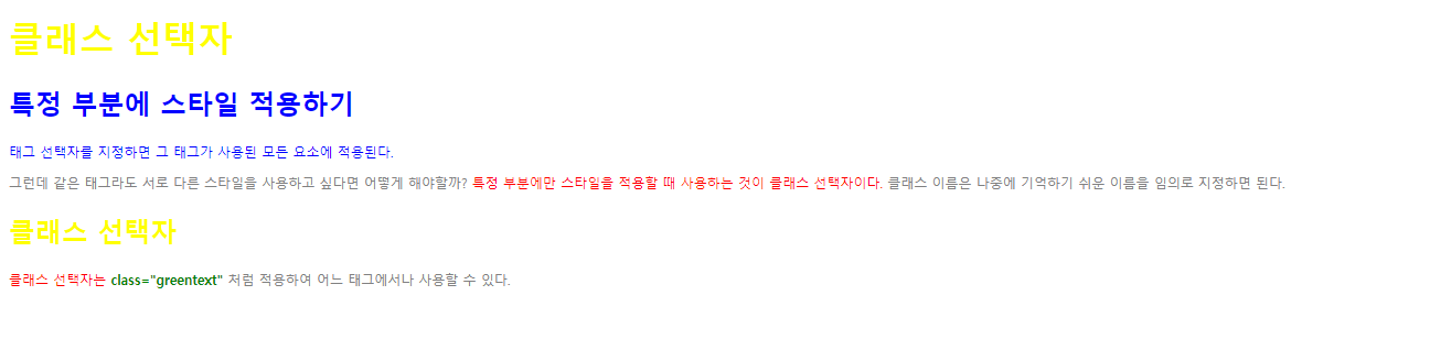 <span class="redtext">특정 부분에만 스타일을 적용할 때 사용하는 것이 클래스 선택자이다.</span><!-- 빨간색 -->