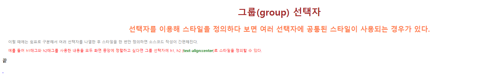 그룹 선택자에 h1, h2 {<strong class="blue">text-align:center</strong>}로 스타일을 정의할 수 있다.
