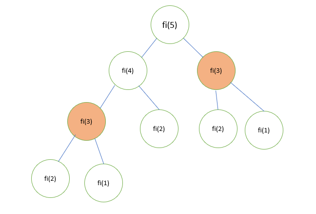 메모이제이션 기법을 사용하게 되면 5번째 피보나치 수를 호출할 때에는 다음 그림처럼 색칠한 노드만