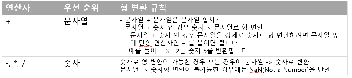 자바스크립트는 다른 자료형 간의 연산을 할 때 명시적으로 변환을 하지 않아도 자동으로 형 변환을 해줍니다.