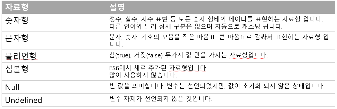 Null이라고 부르는 원시형 타입은 변수가 빈 값으로 초기화 된 상태입니다.